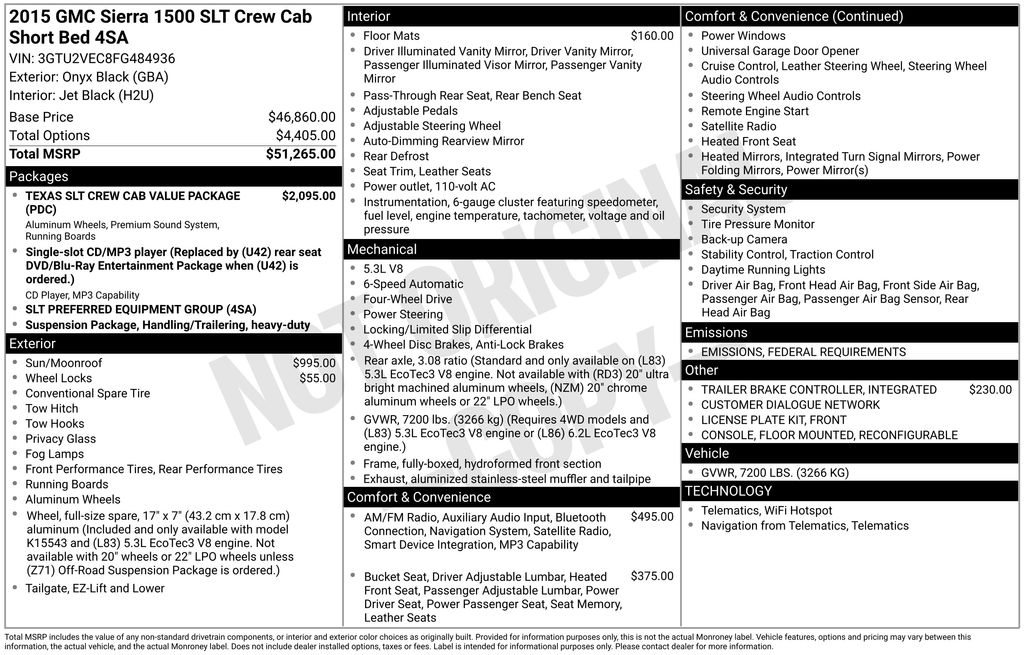 teps, ABS brakes, Adjustable pedals, Air Conditioning, Alloy wheels, AM/FM radio: SiriusXM, Auto-dimming door mirrors, Auto-Dimming Inside Rear-View Mirror, Auto-dimming Rear-View mirror, Automatic temperature control, Auxiliary External Transmission Oil Cooler, Bodyside moldings, Bose Speaker System, Brake assist, Bumpers: chrome, CD player, Chrome Bodyside Moldings, Chrome Door Handles, Chrome Front Bumper, Chrome Grille Surround, Chrome Mirror Caps, Chrome Rear Bumper, Color-Keyed Carpeting w/Rubberized Vinyl Floor Mats, Compass, Deep-Tinted Glass, Delay-off headlights, Driver & Front Passenger Illuminated Vanity Mirrors, Driver door bin, Driver vanity mirror, Dual front impact airbags, Dual front side impact airbags, Dual-Zone Automatic Climate Control, Electric Rear-Window Defogger, Electronic Autotrac Transfer Case, Electronic Stability Control, Emergency communication system: OnStar Directions & Connections, Exterior Parking Camera Rear, EZ Lift & Lower Tailgate, Floor Mounted Console, Front & Rear All-Weather Floor Mats, Front anti-roll bar, Front Center Armrest w/Storage, Front dual zone A/C, Front fog lights, Front Frame-Mounted Black Recovery Hooks, Front Full Feature Power Reclining Bucket Seats, Front Halogen Fog Lamps, Front License Plate Kit, Front reading lights, Front wheel independent suspension, Fully automatic headlights, Garage door transmitter: HomeLink, Heated door mirrors, Heated Driver & Front Passenger Seats, Heated front seats, Heavy Duty Suspension, Heavy-Duty Rear Locking Differential, Illuminated entry, Integrated Trailer Brake Controller, Leather Appointed Seat Trim, Leather Wrapped Steering Wheel w/Cruise Controls, LED Cargo Box Lighting, Low tire pressure warning, Manual Tilt Wheel Steering Column, Occupant sensing airbag, OnStar 6 Months Directions & Connections Plan, OnStar w/4G LTE, Outside temperature display, Overhead airbag, Overhead console, Panic alarm, Passenger door bin, Passenger vanity mirror, Power Adjustable Pedals, Power door mirrors, Power driver seat, Power Folding & Adjustable Heated Outside Mirrors, Power passenger seat, Power steering, Power windows, Power Windows w/Driver Express Up & Down, Preferred Equipment Group 4SA, Premium audio system: IntelliLink, Radio data system, Radio: AM/FM Stereo w/8" Diagonal Color Touch Nav., Radio: AM/FM Stereo w/8" Diagonal Color Touch Screen, Rear 60/40 Folding Bench Seat (Folds Up), Rear Bumper Cornersteps, Rear reading lights, Rear seat center armrest, Rear step bumper, Rear Vision Camera w/Dynamic Guide Lines, Rear Wheelhouse Liners, Rear window defroster, Remote Keyless Entry, Remote keyless entry, Remote Vehicle Starter System, Security system, Single Slot CD/MP3 Player, SiriusXM Satellite Radio, Speed control, Speed-sensing steering, Split folding rear seat, Steering Wheel Audio Controls, Steering wheel mounted audio controls, Tachometer, Telescoping steering wheel, Texas Emblem, Texas SLT Crew Cab Value Package, Theft Deterrent System (Unauthorized Entry), Tilt steering wheel, Traction control, Trailering Equipment, Trip computer, Turn signal indicator mirrors, Universal Home Remote, Variably intermittent wipers, Voltmeter, Wheel Locks (Set of 4) (LPO), Wheels: 18" x 8.5" Polished Aluminum, **LEATHER SEATS**, 6-Speed Automatic Electronic with Overdrive, 4WD, Jet Black w/Leather Appointed Seat Trim, Memory seat, Power Sunroof.