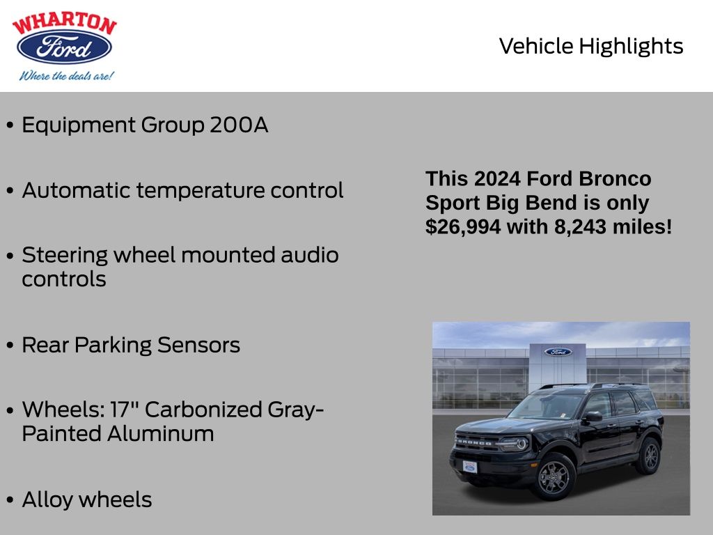 Certified. Shadow Black 2024 Ford Bronco Sport Big Bend 4WD 8-Speed Automatic 1.5L EcoBoost Alloy wheels, Automatic temperature control, Equipment Group 200A, Rear Parking Sensors, Steering wheel mounted audio controls, Wheels: 17" Carbonized Gray-Painted Aluminum.